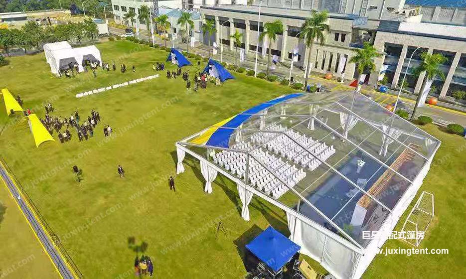 因篷房對搭建場所要求不高,可以搭建在草坪上、水泥地上、水面上等等,活動舉辦者可以更靈活地選擇自己想要搭建的場所。為了更為人性化,透明篷房還有各種形狀和靈活的結(jié)構(gòu)組合,而且搭建簡易迅速、施工周期短,非常適合用于戶外短期或者長期的活動。