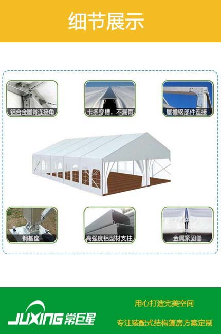 常巨星裝配式篷房公司是一家篷房研發(fā)、生產(chǎn)、銷售、租賃于一體的綜合性篷房公司。常巨星公司秉著誠信經(jīng)營、客戶至上的經(jīng)驗理念服務(wù)客戶。戶外活動篷房跨度從3-50m不等,長度可按3或5m的倍數(shù)無限延伸,高度可以做到5m、7m甚至更高,巨星篷房廠家還可以為客戶提供活動篷房定制服務(wù)。活動舉辦方可以在篷房外部印上自己的logo或標(biāo)語以起到更好的宣傳效果。